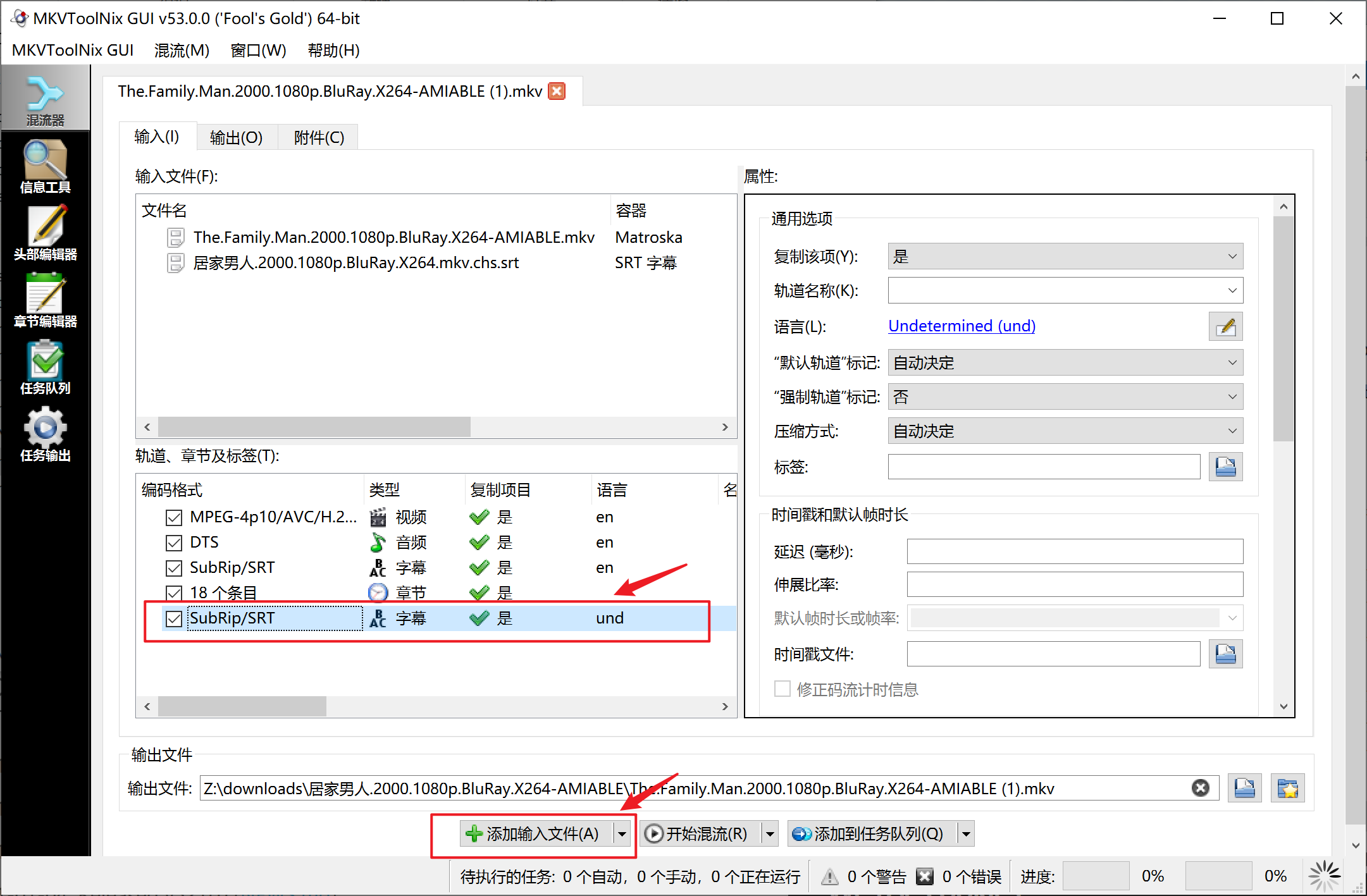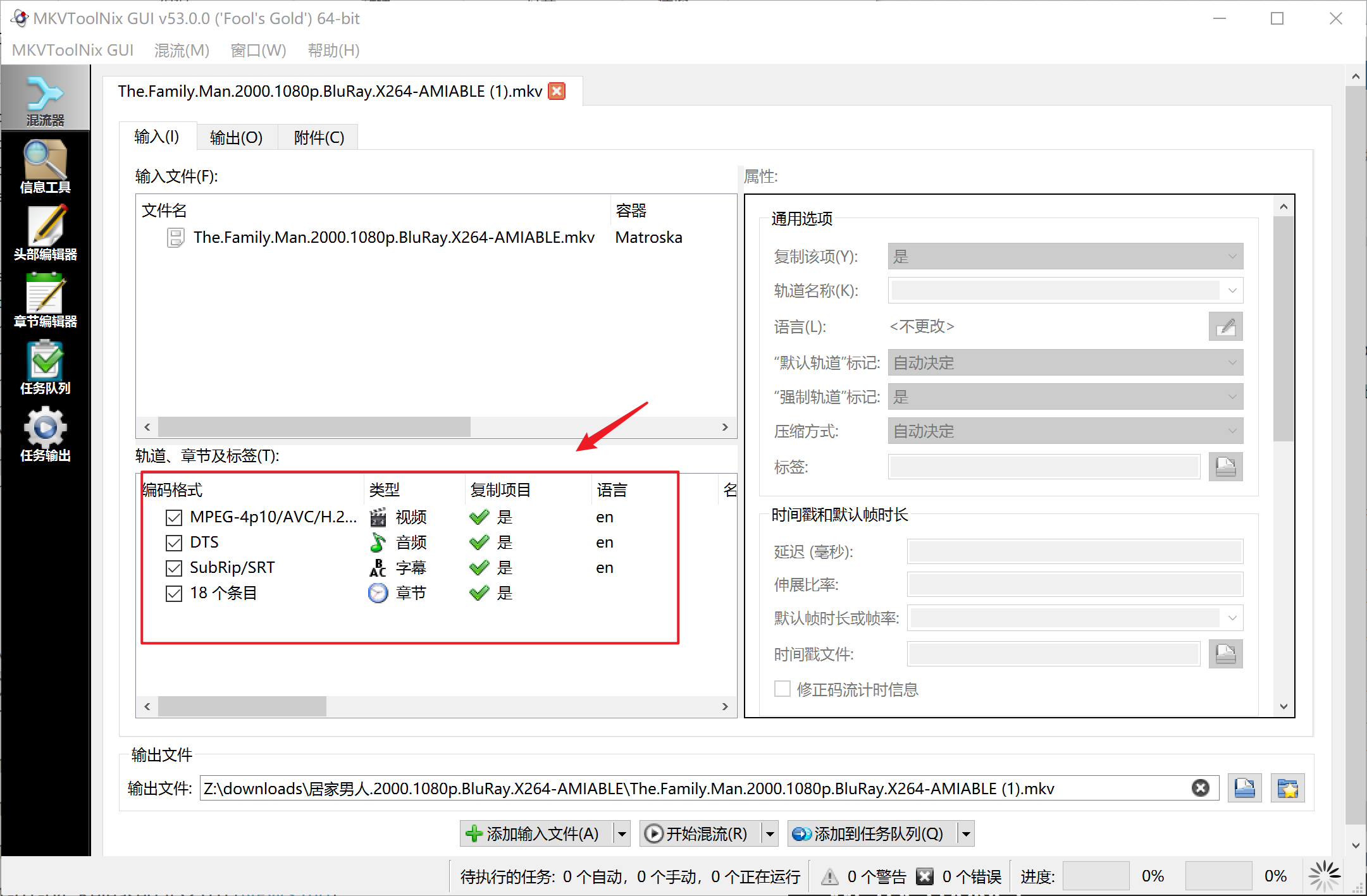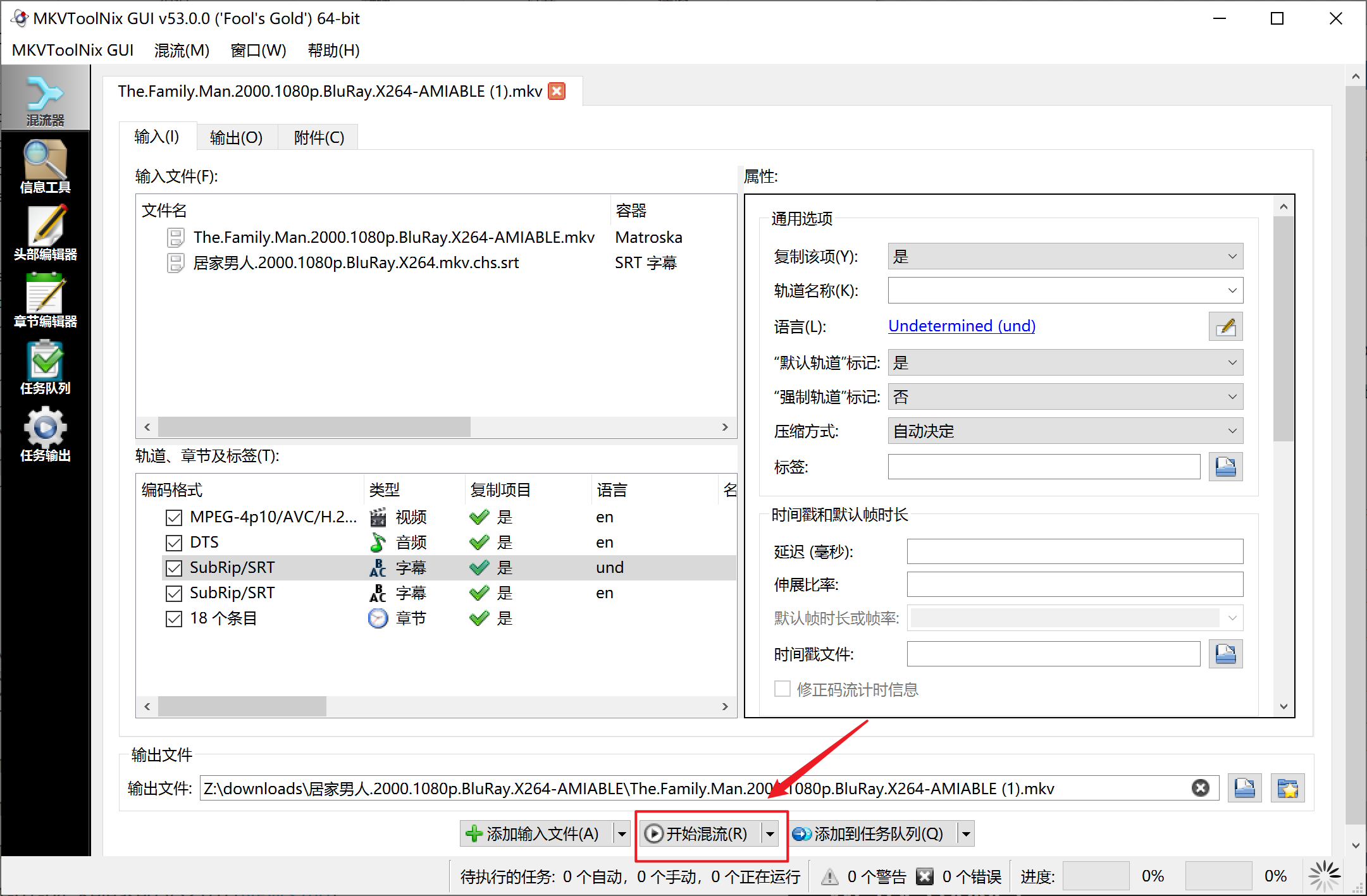 点击最下面的开始混流按钮,等进度条跑到 100%,就合成输出新的 mkv 文件了:)