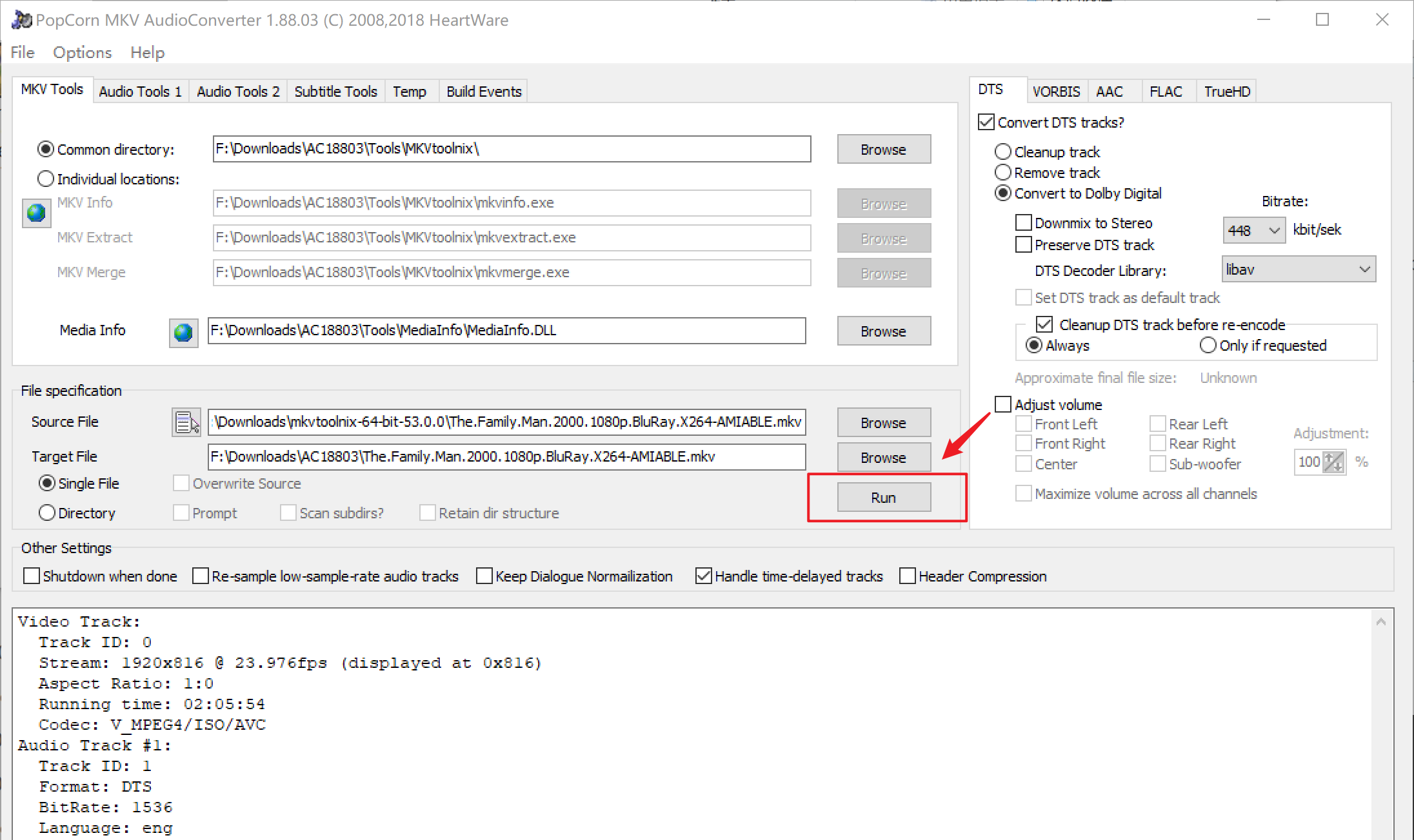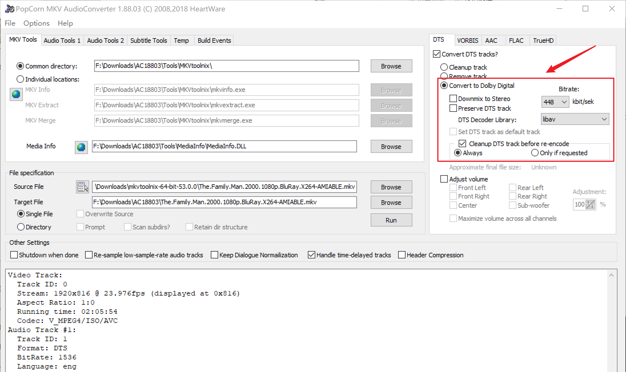 在右边的DTS属性框,选择Convert to Dolby Digital,Bitrate 一般选择448就可以了,Cleanup DTS track before re-encode选择Always,这样会把原有的 DTS 音轨删除,避免影响 DLNA 服务播放。