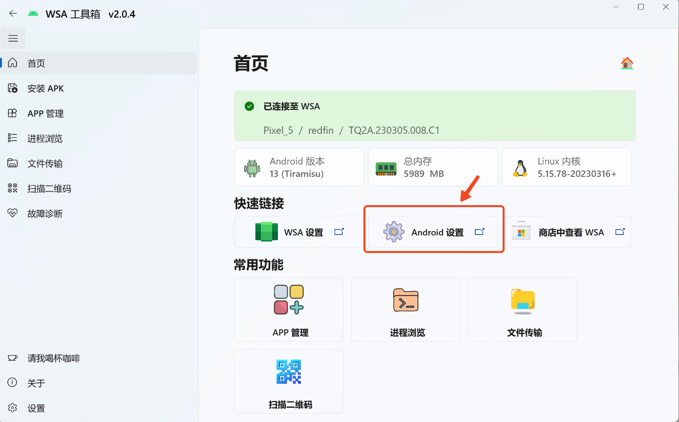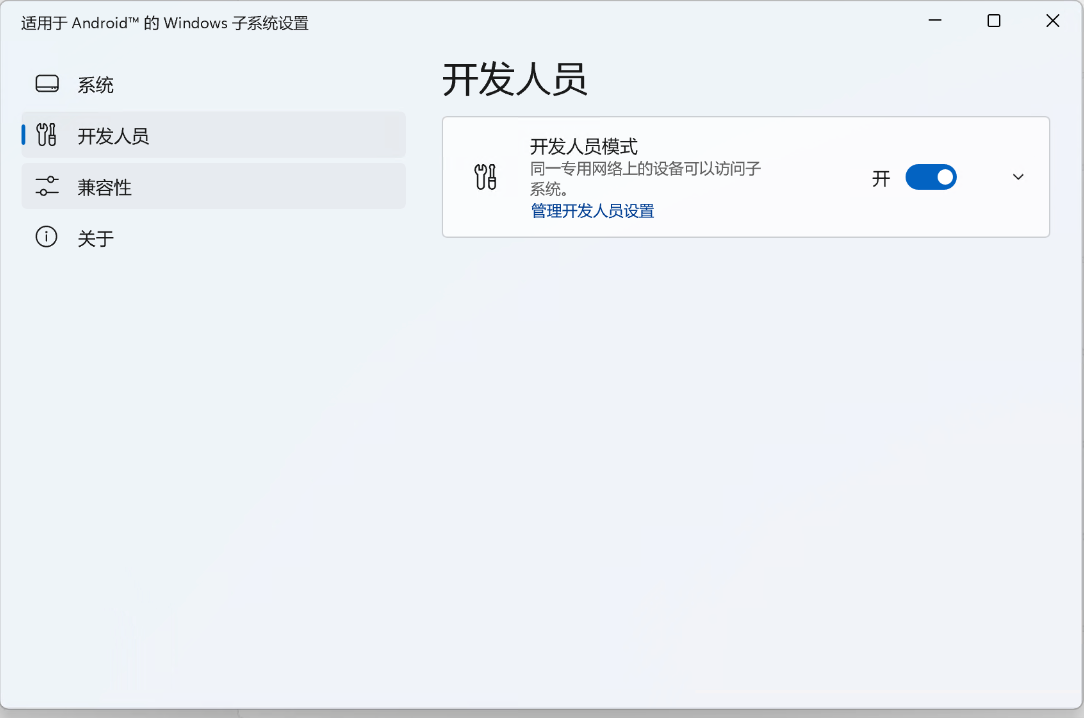 android,找到 WSA 设置应用并打开,选择开发人员,并打开开发人员模式