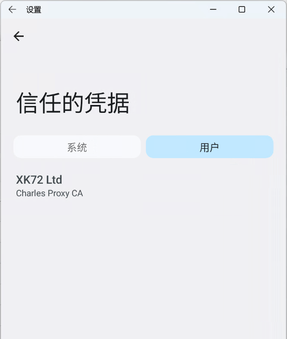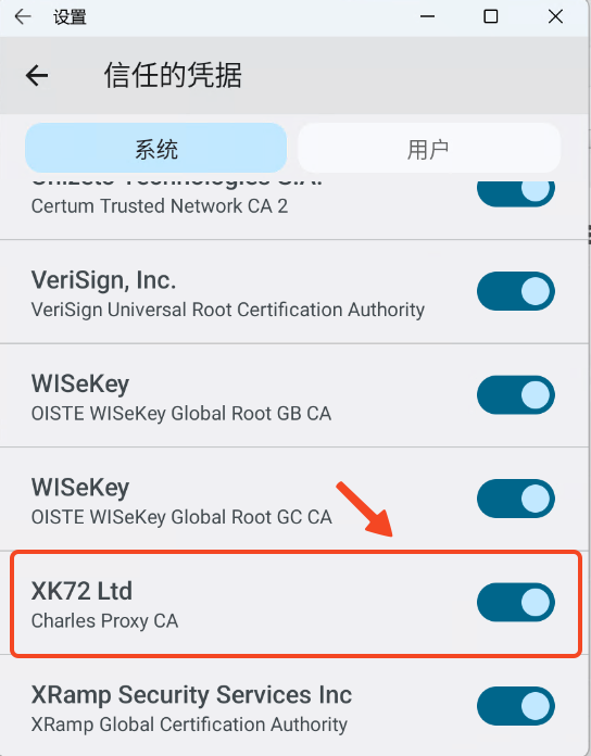 加密与凭据->信任的凭据->系统中,看到charles证书